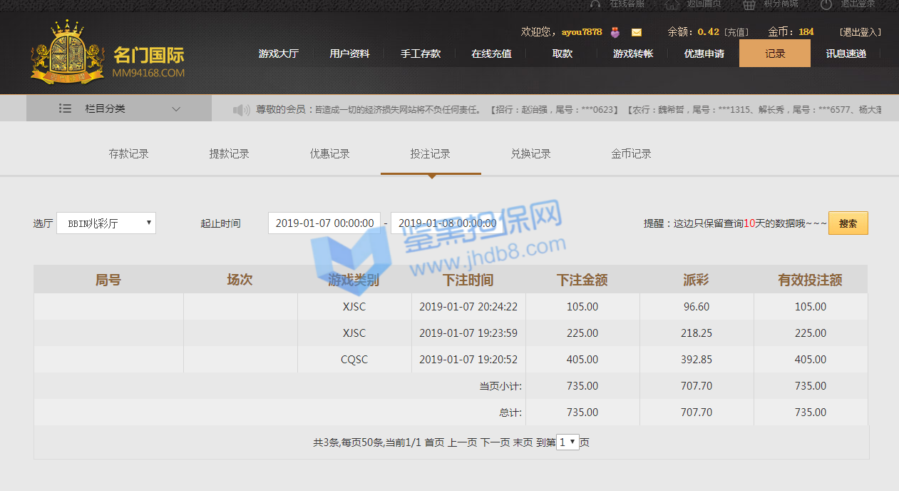 这个月想在云顶家打VIP,于是基本体育时时彩都在他家玩了。之前有过一次波音流水不更新。到账我10多个小时才取款。我回头看看我和他们之前那半小时回复一次客服的对话,我自己都感到心酸啊。 这几天去参加活动。无奈啊又开始同样的剧本了。我存了9000元。到现在还流水不足。在波音打了一万多流水了。在他的投注后台记录里面只有四五千。我也是搞不懂这机制了。客服一直和我说我的流水额度不足。我把我的这些在游戏里面的投注截图给他们看,他们永远视而不见。我找他们的微信客服经理。他和我说国际线路异常、可是也没这样的异常法吧。一下子流水会更新。一下子流水又没了。 而且说会补回具体是什么时候呢。上次一样情况少了我一万多流水,说实话反水钱倒是小事情我也不在乎。问题是你们家这样的情况发生。真的是把玩家作报告啊。我这人真心不喜欢吐槽或者责怪什么事情。毕竟和气生财。问题是这个事情是一而再再而三发生了。而且你们的客服明显机器人一样的敷衍了事每次说这些事情。这样的客服质量我是真心没遇到多少过。你们说可不可气啊。作为玩家还要求着客服帮你解决事情,流水快2倍了还不能取款。希望鉴黑担保网的客服能把我说的及时反馈下吧。真心的无奈