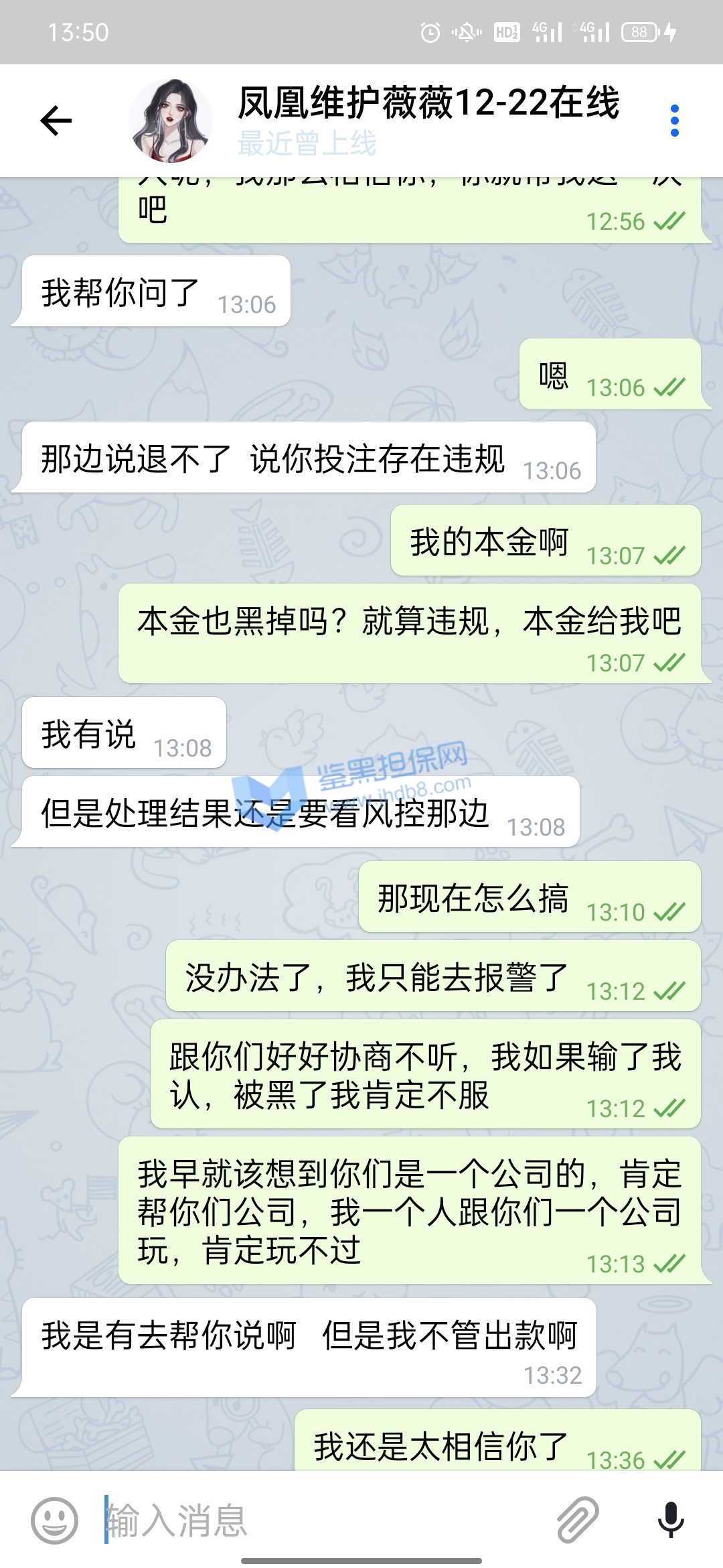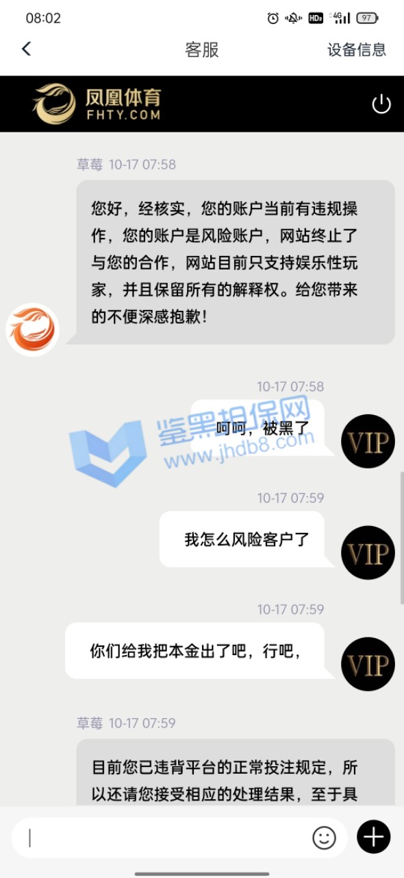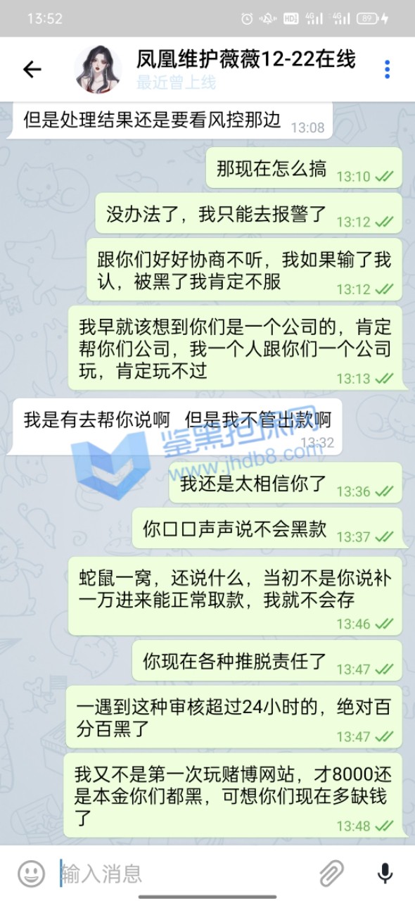 我10月11号支付宝转银行卡存款10000在平台,到账了后我立刻就玩了,途中我支付宝给我发信息这笔款退回了,也就是说没成功到他们那边,那他们给我这10000分怎么弄得,还显示存款成功,我心里面美滋滋的,就没管也没去找诉说,毕竟得了便宜了,等打完流水当时盈利了差不多3645提款显示如图1被限制出款,我就去问客服,客服给我的回答是财务没收到款,优先给我上的分,等财务收到了会处理提款通道!我心里一想这事也没普啊,就没想着提了,也没想过补回了,就去转pg电子玩,结果出乎意料出了很多免费,我就出了免费就退出,出了免费就退出,差不多有三五个这样的免费,一百一转的,当时台面就剩1205,我想的是这么多免费随便一爆也好几万了,存一万补回他们给我优先上的一万就好了。当时也有疑虑还去咨询了我的线下彩金福利,他也说存回去补上就能正常存取了,由于不确定免费到底能爆多少,万一爆不到一万,我存了有啥意义,我就再存前去免费里放了分,一看有12000了,赶紧偷了我妈手机存款完后删除转账记录补上提款赶紧还回来吧,存上后客服刚开始说扣除盈利只留一万本金,我当时就蒙了,想想还有那么多免费,留一万就一万吧,结果没一会直接给我留了1205,我问为什么也是莫名其妙一大推我看不懂的借口,当时心里还是想着只要能正常取款反正有免费在那藏着,只要能给我出,我就不亏,也没多理论,就把台面的1205赶紧试着提款一千,结果没一会到账了,我心里还有点开心,也紧张,就想着应该稳了,就去免费里转,转了一下就爆了一千,我就赶紧又把1210一下子全提了,当时在紧张焦急的等待十来分钟后也到账了,当时台面没有分了,我心想一分没有拿什么赢,就又存进去两百随便打了几下再去放分,这次放了9300提款8000,留了1300在余额,结果就遇到一小时不到账,我就问客服,客服让我提供手持身份证银行卡并写日期的白纸拍照给他们说什么身份验证,我想想也有道理,当时提款心比较急切,就按他们的提交了,提交后来了句要审核七天,我一听就慌了,当时还是相信他们的,毕竟凤凰平台我玩了308天了在这总体肯定是输,直到今天我想登进去看审核进度,才发现设备存在风险,无法使用本平台。下面图都在下面,请鉴黑网帮我维权,被我妈发现我就完了,我给你们跪谢了!!
